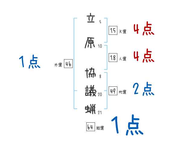外運![]() | 立原協議蝋さんの外運は46画の1つ星!迷走することが多く苦労するかも。目先のことにとらわれないように。 生活面を象徴する運勢です。外部から受ける影響力を表し、結婚運、家庭運や職場、環境への順応性を表します。 |