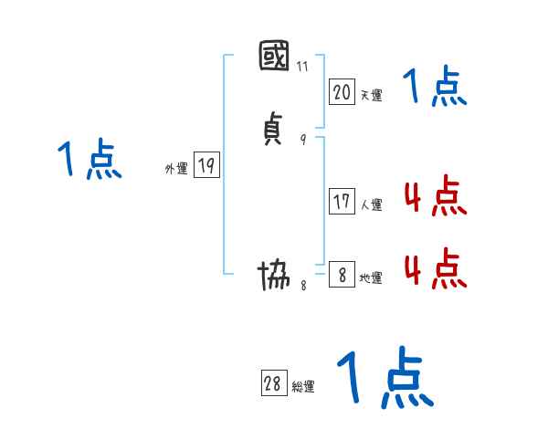 総運![]() | 國貞協さんの総運は28画の1つ星!家庭環境に注意。スポーツで活躍できる能力があるかも。 あなたの人生を表す1番重要な運勢です。生涯を通じて影響する総合運となり、主に50歳以降の晩年期に影響を及ぼします。 |