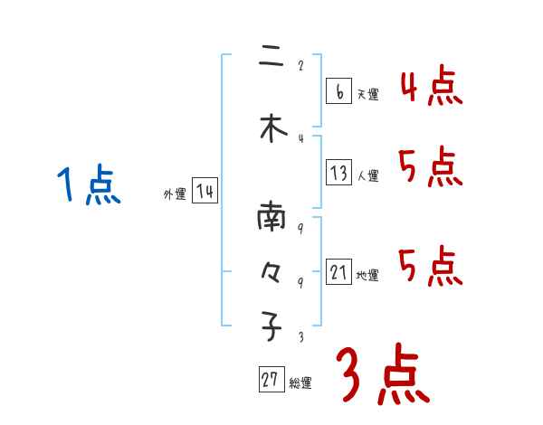 外運![]() | 二木南々子さんの外運は14画の1つ星!人に対して優しいがストレスを溜め込みがち。人間関係のトラブルを避けるよう気をつけましょう。 生活面を象徴する運勢です。外部から受ける影響力を表し、結婚運、家庭運や職場、環境への順応性を表します。 |
