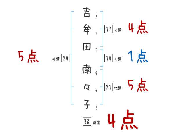 外運![]() | 吉牟田南々子さんの外運は24画の5つ星!家庭運が良く順調な人生。金運にも恵まれる。 生活面を象徴する運勢です。外部から受ける影響力を表し、結婚運、家庭運や職場、環境への順応性を表します。 |
