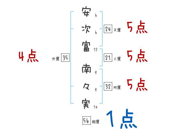 外運![]() | 安次富南々実さんの外運は35画の4つ星!温厚な性格で感受性が高い。穏和な性格で人望が厚い。 生活面を象徴する運勢です。外部から受ける影響力を表し、結婚運、家庭運や職場、環境への順応性を表します。 |