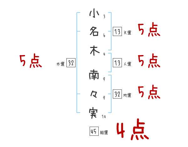 外運![]() | 小名木南々実さんの外運は32画の5つ星!柔軟性があり成功する。チャンスが多く金運が良い。 生活面を象徴する運勢です。外部から受ける影響力を表し、結婚運、家庭運や職場、環境への順応性を表します。 |