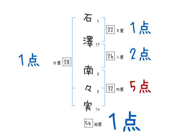 総運![]()  | 石澤南々実さんの総運は54画の1つ星!トラブルが多いかも。周りをよく見て協調して過ごしましょう。 あなたの人生を表す1番重要な運勢です。生涯を通じて影響する総合運となり、主に50歳以降の晩年期に影響を及ぼします。 |