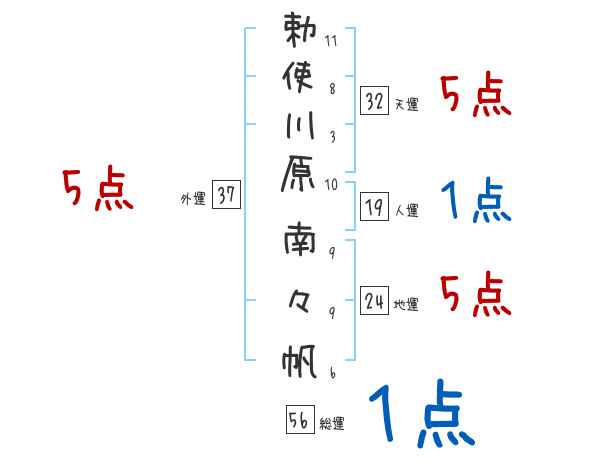 天運![]() | 勅使川原南々帆さんの天運は32画の5つ星!柔軟性があり成功する。チャンスが多く金運が良い。 家系が持つ宿命的な運勢を表します。祖先から受け継いだ苗字ですので自分の力が及びません。家柄を象徴します。 |