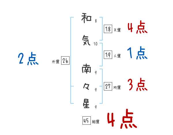 天運![]() | 和気南々星さんの天運は18画の4つ星!情熱的で剛気。忍耐力があり信頼される。 家系が持つ宿命的な運勢を表します。祖先から受け継いだ苗字ですので自分の力が及びません。家柄を象徴します。 |