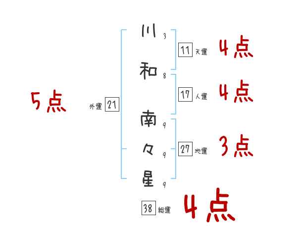 天運![]() | 川和南々星さんの天運は11画の4つ星!着実に富や地位を得る幸運な人生。 家系が持つ宿命的な運勢を表します。祖先から受け継いだ苗字ですので自分の力が及びません。家柄を象徴します。 |
