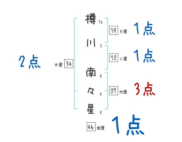 外運![]() | 樽川南々星さんの外運は34画の2つ星!独創性に優れるが、自尊心が強く災難に注意しましょう。 生活面を象徴する運勢です。外部から受ける影響力を表し、結婚運、家庭運や職場、環境への順応性を表します。 |
