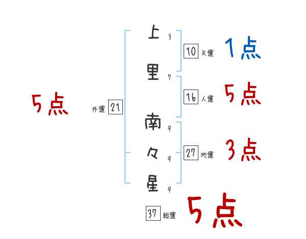 人運![]() | 上里南々星さんの人運は16画の5つ星!人望が厚く大きく発展する。逆転成功が見える。 性格や才能などを表す2番目に重要な運勢です。人間関係や協調性、社会的な成功に影響します。主に20歳から50歳ぐらいまでの中年期の運勢を表します。 |
