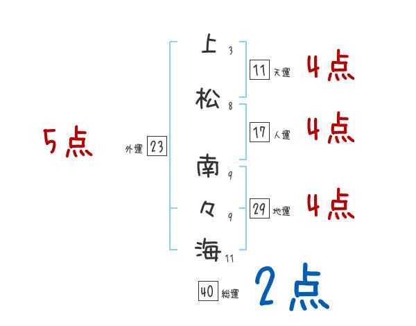 天運![]() | 上松南々海さんの天運は11画の4つ星!着実に富や地位を得る幸運な人生。 家系が持つ宿命的な運勢を表します。祖先から受け継いだ苗字ですので自分の力が及びません。家柄を象徴します。 |