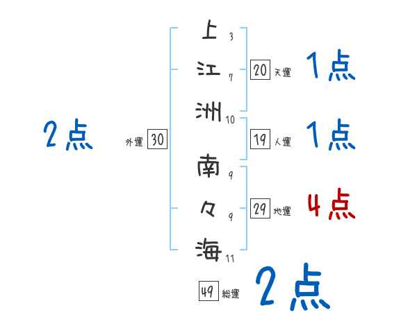 外運![]() | 上江洲南々海さんの外運は30画の2つ星!浮き沈みの激しさに注意しましょう。 生活面を象徴する運勢です。外部から受ける影響力を表し、結婚運、家庭運や職場、環境への順応性を表します。 |