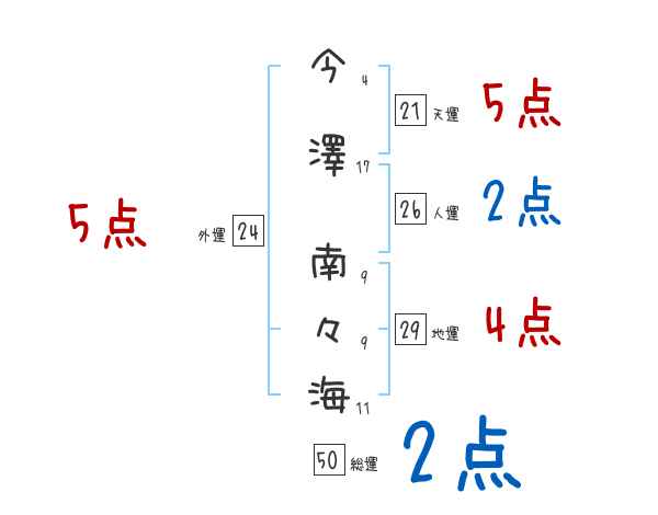 総運![]() | 今澤南々海さんの総運は50画の2つ星!浮き沈みが激しく不安定。しりすぼみに衰退しやすいので注意しましょう。 あなたの人生を表す1番重要な運勢です。生涯を通じて影響する総合運となり、主に50歳以降の晩年期に影響を及ぼします。 |
