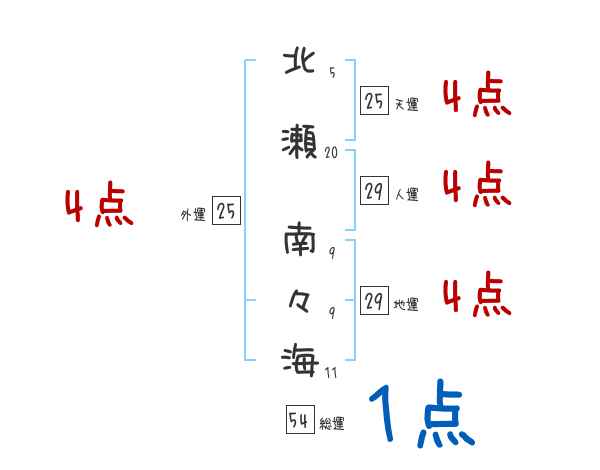 総運![]() | 北瀬南々海さんの総運は54画の1つ星!トラブルが多いかも。周りをよく見て協調して過ごしましょう。 あなたの人生を表す1番重要な運勢です。生涯を通じて影響する総合運となり、主に50歳以降の晩年期に影響を及ぼします。 |