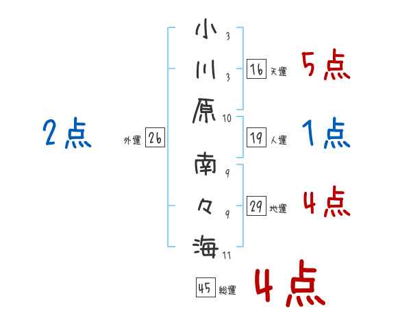 外運![]() | 小川原南々海さんの外運は26画の2つ星!波瀾万丈かも。信頼できる人を大事にしましょう。 生活面を象徴する運勢です。外部から受ける影響力を表し、結婚運、家庭運や職場、環境への順応性を表します。 |
