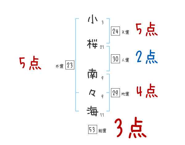 総運![]() | 小桜南々海さんの総運は53画の3つ星!やや見栄っ張りで虚栄心がある。散財に注意。 あなたの人生を表す1番重要な運勢です。生涯を通じて影響する総合運となり、主に50歳以降の晩年期に影響を及ぼします。 |