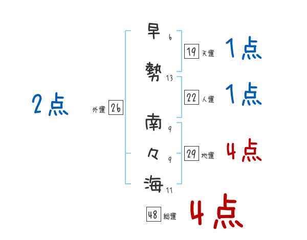 外運![]() | 早勢南々海さんの外運は26画の2つ星!波瀾万丈かも。信頼できる人を大事にしましょう。 生活面を象徴する運勢です。外部から受ける影響力を表し、結婚運、家庭運や職場、環境への順応性を表します。 |