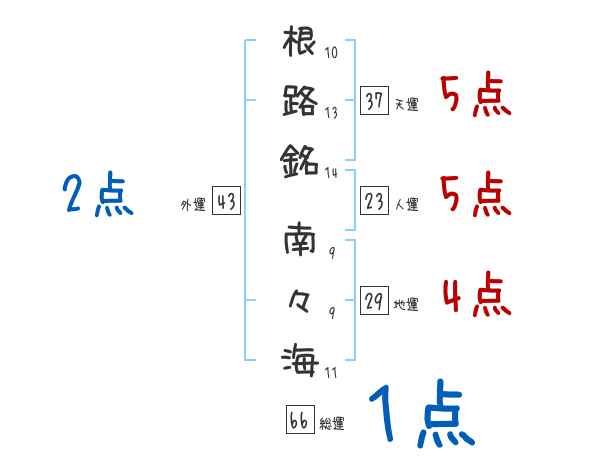 総運![]() | 根路銘南々海さんの総運は66画の1つ星!迷うことが多く挫折しやすい傾向が。辛抱強く物事に取り組みましょう。 あなたの人生を表す1番重要な運勢です。生涯を通じて影響する総合運となり、主に50歳以降の晩年期に影響を及ぼします。 |