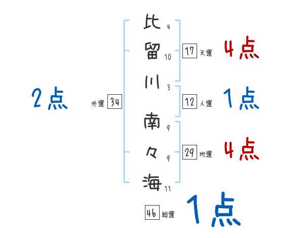総運![]() | 比留川南々海さんの総運は46画の1つ星!迷走することが多く苦労するかも。目先のことにとらわれないように。 あなたの人生を表す1番重要な運勢です。生涯を通じて影響する総合運となり、主に50歳以降の晩年期に影響を及ぼします。 |
