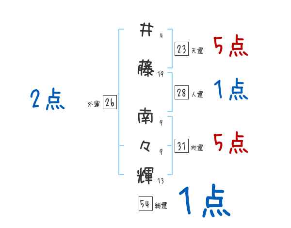 外運![]() | 井藤南々輝さんの外運は26画の2つ星!波瀾万丈かも。信頼できる人を大事にしましょう。 生活面を象徴する運勢です。外部から受ける影響力を表し、結婚運、家庭運や職場、環境への順応性を表します。 |