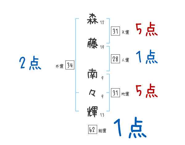天運![]() | 森藤南々輝さんの天運は31画の5つ星!社交性があり判断力に優れる。順風満帆な人生で円満な生活。 家系が持つ宿命的な運勢を表します。祖先から受け継いだ苗字ですので自分の力が及びません。家柄を象徴します。 |