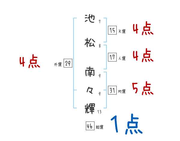 外運![]() | 池松南々輝さんの外運は29画の4つ星!完全主義で才能がある。厳格な心の持ち主。 生活面を象徴する運勢です。外部から受ける影響力を表し、結婚運、家庭運や職場、環境への順応性を表します。 |