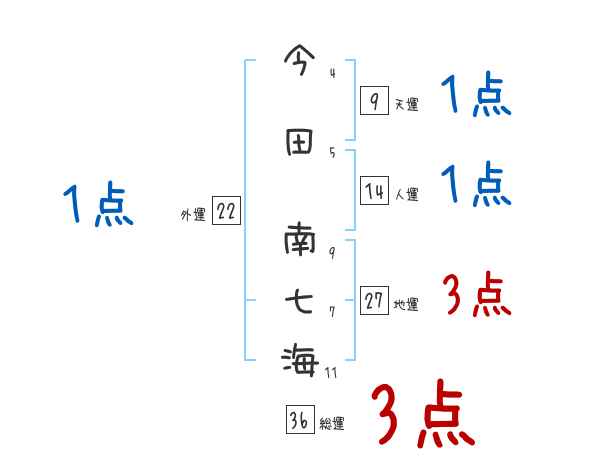 外運![]() | 今田南七海さんの外運は22画の1つ星!努力することが苦手ないっぽう手先が器用。芸術性にも優れる。 生活面を象徴する運勢です。外部から受ける影響力を表し、結婚運、家庭運や職場、環境への順応性を表します。 |