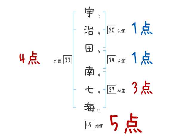 総運![]() | 宇治田南七海さんの総運は47画の5つ星!実力が開花し発展する円満な人生。財に恵まれる。 あなたの人生を表す1番重要な運勢です。生涯を通じて影響する総合運となり、主に50歳以降の晩年期に影響を及ぼします。 |