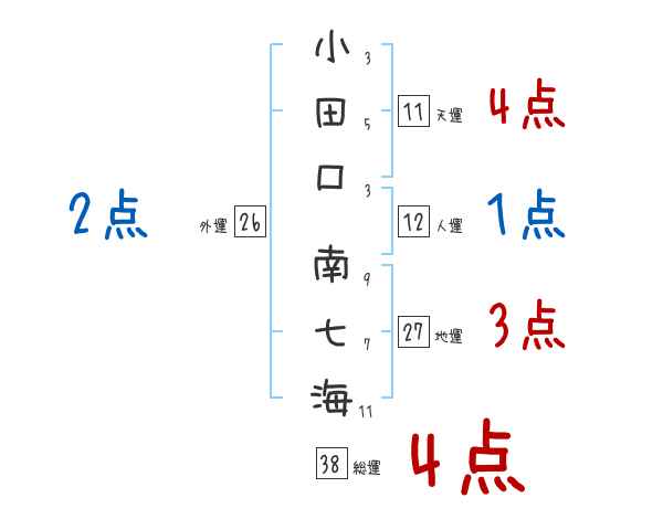 天運![]() | 小田口南七海さんの天運は11画の4つ星!着実に富や地位を得る幸運な人生。 家系が持つ宿命的な運勢を表します。祖先から受け継いだ苗字ですので自分の力が及びません。家柄を象徴します。 |