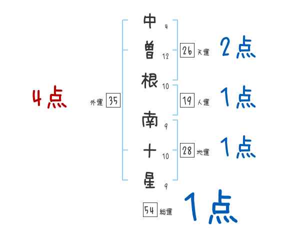 外運![]() | 中曽根南十星さんの外運は35画の4つ星!温厚な性格で感受性が高い。穏和な性格で人望が厚い。 生活面を象徴する運勢です。外部から受ける影響力を表し、結婚運、家庭運や職場、環境への順応性を表します。 |