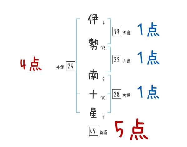 天運![]() | 伊勢南十星さんの天運は19画の1つ星!優れた才能を持ちますが、協調性が足りないことも。周りの人と協力する事を意識しましょう。 家系が持つ宿命的な運勢を表します。祖先から受け継いだ苗字ですので自分の力が及びません。家柄を象徴します。 |