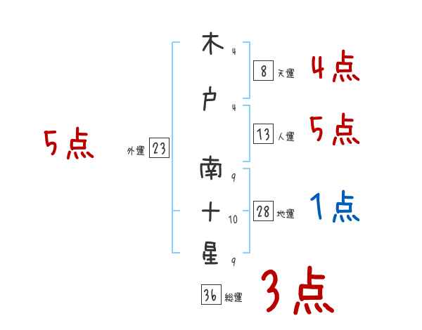 人運![]() | 木戸南十星さんの人運は13画の5つ星!才能に恵まれ人気がある。名声を手に入れる。円満な人生。 性格や才能などを表す2番目に重要な運勢です。人間関係や協調性、社会的な成功に影響します。主に20歳から50歳ぐらいまでの中年期の運勢を表します。 |