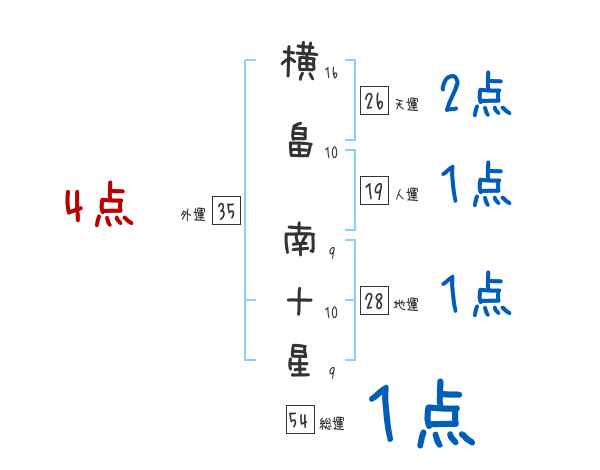 外運![]() | 横畠南十星さんの外運は35画の4つ星!温厚な性格で感受性が高い。穏和な性格で人望が厚い。 生活面を象徴する運勢です。外部から受ける影響力を表し、結婚運、家庭運や職場、環境への順応性を表します。 |