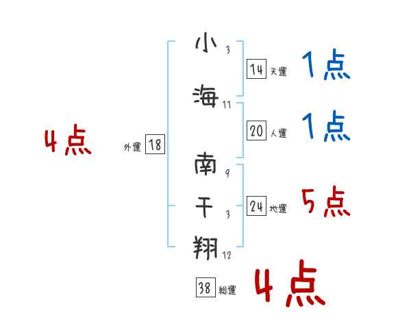 地運![]() | 小海南千翔さんの地運は24画の5つ星!家庭運が良く順調な人生。金運にも恵まれる。 個性を表す基礎的な運勢です。性格形成や対人関係、行動力など家庭環境に影響されます。主に誕生してから20歳くらいまでの若年期の運勢を表します。 |