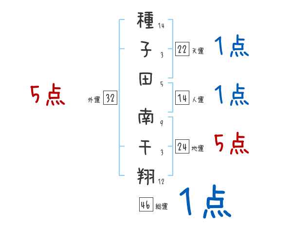 外運![]() | 種子田南千翔さんの外運は32画の5つ星!柔軟性があり成功する。チャンスが多く金運が良い。 生活面を象徴する運勢です。外部から受ける影響力を表し、結婚運、家庭運や職場、環境への順応性を表します。 |