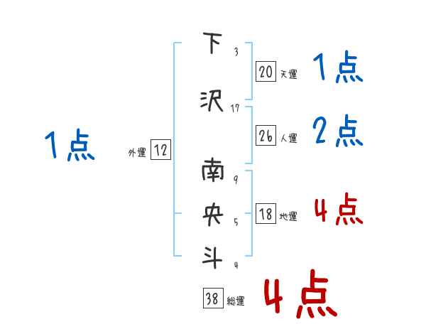 外運![]() | 下沢南央斗さんの外運は12画の1つ星!簡単な失敗で諦めてしまいやすいかも。着実に行動すると良いでしょう。 生活面を象徴する運勢です。外部から受ける影響力を表し、結婚運、家庭運や職場、環境への順応性を表します。 |