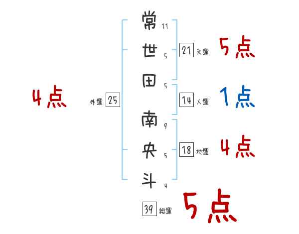 天運![]() | 常世田南央斗さんの天運は21画の5つ星!統率力がある。独立し成功する。名誉を手に入れる。 家系が持つ宿命的な運勢を表します。祖先から受け継いだ苗字ですので自分の力が及びません。家柄を象徴します。 |