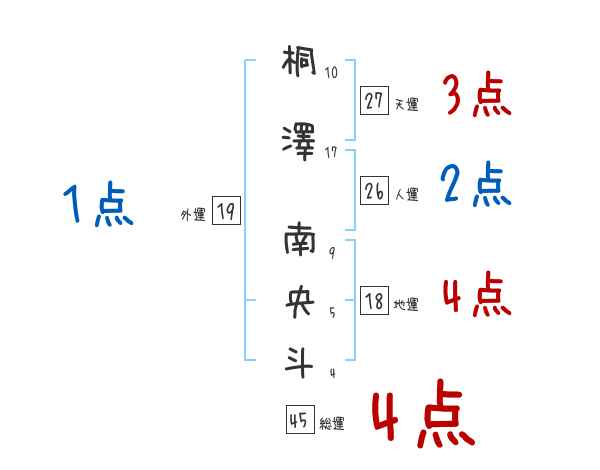 外運![]() | 桐澤南央斗さんの外運は19画の1つ星!優れた才能を持ちますが、協調性が足りないことも。周りの人と協力する事を意識しましょう。 生活面を象徴する運勢です。外部から受ける影響力を表し、結婚運、家庭運や職場、環境への順応性を表します。 |