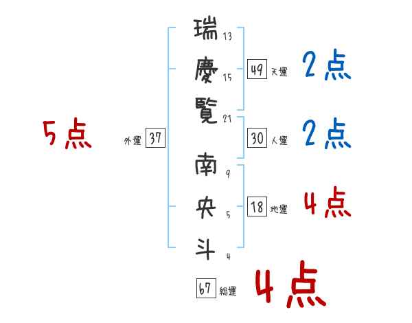 天運![]() | 瑞慶覧南央斗さんの天運は49画の2つ星!不安定な性格で明暗がある人生。周りの人には支援されやすい。 家系が持つ宿命的な運勢を表します。祖先から受け継いだ苗字ですので自分の力が及びません。家柄を象徴します。 |