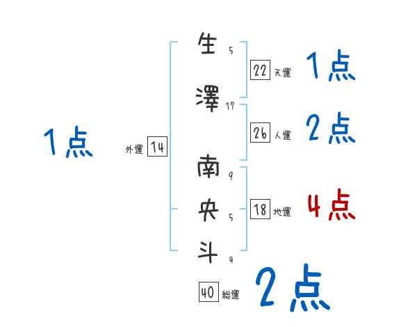 天運![]() | 生澤南央斗さんの天運は22画の1つ星!努力することが苦手ないっぽう手先が器用。芸術性にも優れる。 家系が持つ宿命的な運勢を表します。祖先から受け継いだ苗字ですので自分の力が及びません。家柄を象徴します。 |