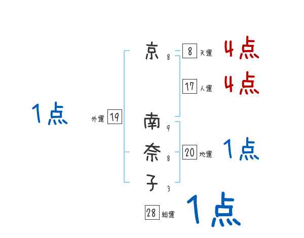 天運![]() | 京南奈子さんの天運は8画の4つ星!勤勉家。根気強く努力し成功する。忍耐力がある。 家系が持つ宿命的な運勢を表します。祖先から受け継いだ苗字ですので自分の力が及びません。家柄を象徴します。 |