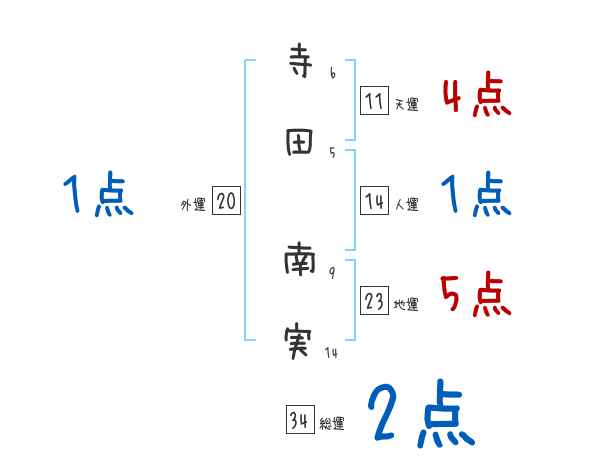総運![]() | 寺田南実さんの総運は34画の2つ星!独創性に優れるが、自尊心が強く災難に注意しましょう。 あなたの人生を表す1番重要な運勢です。生涯を通じて影響する総合運となり、主に50歳以降の晩年期に影響を及ぼします。 |