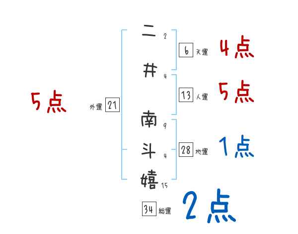 総運![]() | 二井南斗嬉さんの総運は34画の2つ星!独創性に優れるが、自尊心が強く災難に注意しましょう。 あなたの人生を表す1番重要な運勢です。生涯を通じて影響する総合運となり、主に50歳以降の晩年期に影響を及ぼします。 |
