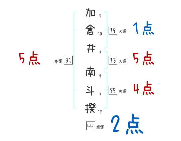 総運![]() | 加倉井南斗揆さんの総運は44画の2つ星!誠実で慎重な性格。物事を考えすぎないように注意しましょう。 あなたの人生を表す1番重要な運勢です。生涯を通じて影響する総合運となり、主に50歳以降の晩年期に影響を及ぼします。 |