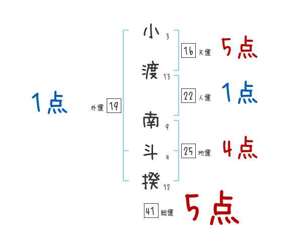 天運![]() | 小渡南斗揆さんの天運は16画の5つ星!人望が厚く大きく発展する。逆転成功が見える。 家系が持つ宿命的な運勢を表します。祖先から受け継いだ苗字ですので自分の力が及びません。家柄を象徴します。 |