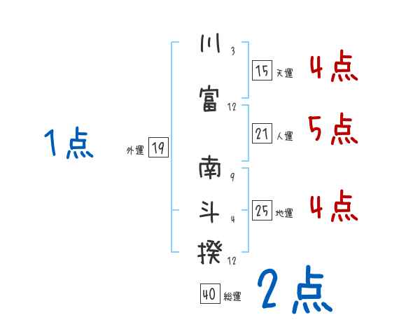 総運![]() | 川富南斗揆さんの総運は40画の2つ星!自信過剰で物事に固執するためトラブルに注意。 あなたの人生を表す1番重要な運勢です。生涯を通じて影響する総合運となり、主に50歳以降の晩年期に影響を及ぼします。 |