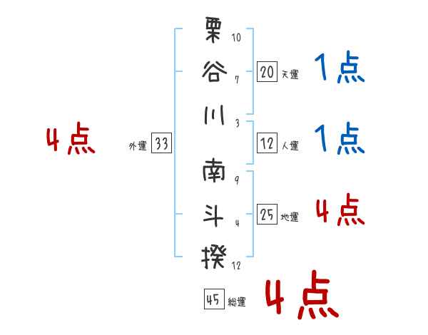 外運![]() | 栗谷川南斗揆さんの外運は33画の4つ星!権力志向でプライドが高い。勇気があり運を切り開き成功する。 生活面を象徴する運勢です。外部から受ける影響力を表し、結婚運、家庭運や職場、環境への順応性を表します。 |