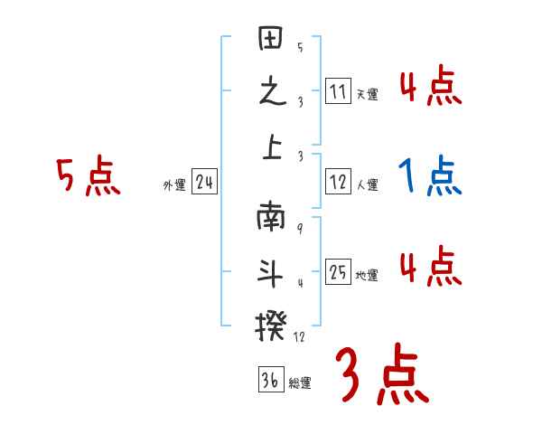 外運![]() | 田之上南斗揆さんの外運は24画の5つ星!家庭運が良く順調な人生。金運にも恵まれる。 生活面を象徴する運勢です。外部から受ける影響力を表し、結婚運、家庭運や職場、環境への順応性を表します。 |