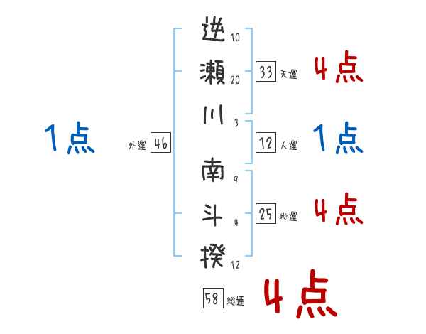 天運![]() | 逆瀬川南斗揆さんの天運は33画の4つ星!権力志向でプライドが高い。勇気があり運を切り開き成功する。 家系が持つ宿命的な運勢を表します。祖先から受け継いだ苗字ですので自分の力が及びません。家柄を象徴します。 |