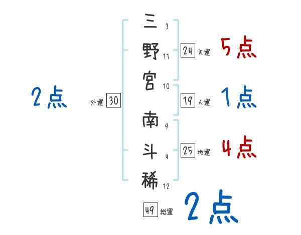 天運![]() | 三野宮南斗稀さんの天運は24画の5つ星!家庭運が良く順調な人生。金運にも恵まれる。 家系が持つ宿命的な運勢を表します。祖先から受け継いだ苗字ですので自分の力が及びません。家柄を象徴します。 |