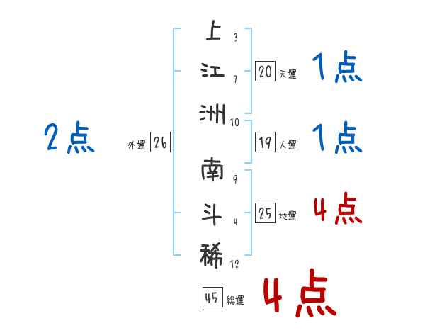 外運![]() | 上江洲南斗稀さんの外運は26画の2つ星!波瀾万丈かも。信頼できる人を大事にしましょう。 生活面を象徴する運勢です。外部から受ける影響力を表し、結婚運、家庭運や職場、環境への順応性を表します。 |