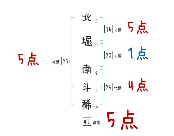 天運![]() | 北堀南斗稀さんの天運は16画の5つ星!人望が厚く大きく発展する。逆転成功が見える。 家系が持つ宿命的な運勢を表します。祖先から受け継いだ苗字ですので自分の力が及びません。家柄を象徴します。 |